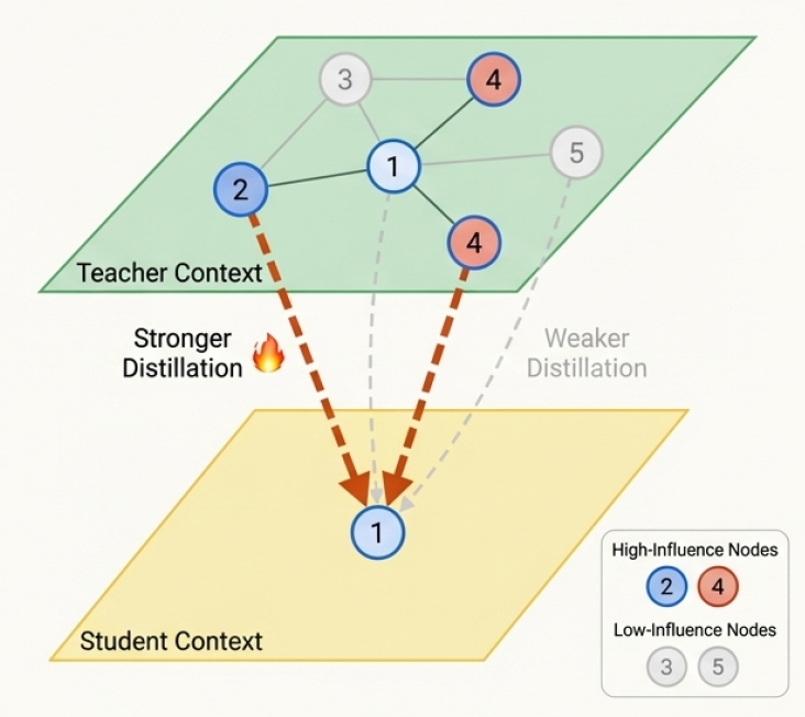 The key insight: high-influence neighbors provide stronger supervision signals. The student learns to prioritize getting these nodes right.